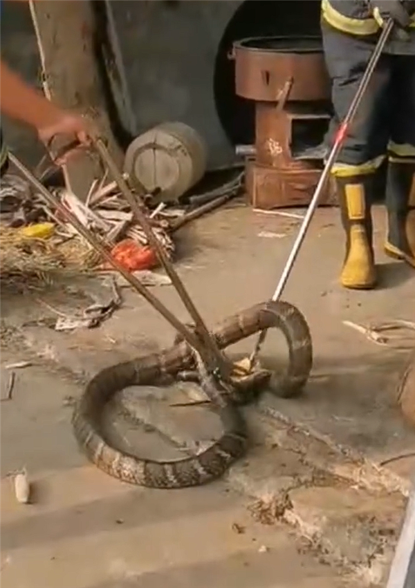 得知有大蛇入村,知消当地居民无不提高警惕,消防救援人员接警后也迅速到达现场,最后在一村民杂物间找到这条眼镜王蛇,三名消防员合作才将这条蛇给控制住,最终测得其体长3米、重约12斤!