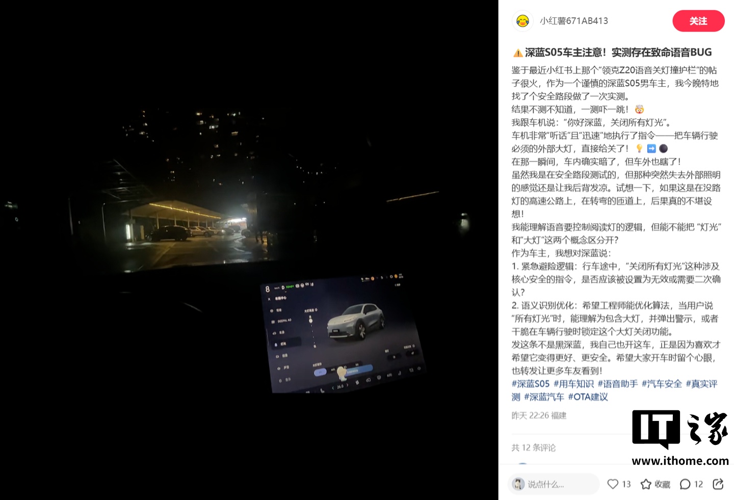 深蓝 S05 车主表示,“我跟车机说:‘你好深蓝,关闭所有灯光’。车机非常‘听话’且‘迅速’地执行了指令 —— 把车辆行驶必须的外部大灯,直接给关了!在那一瞬间,车内确实暗了,但车外也瞎了!”