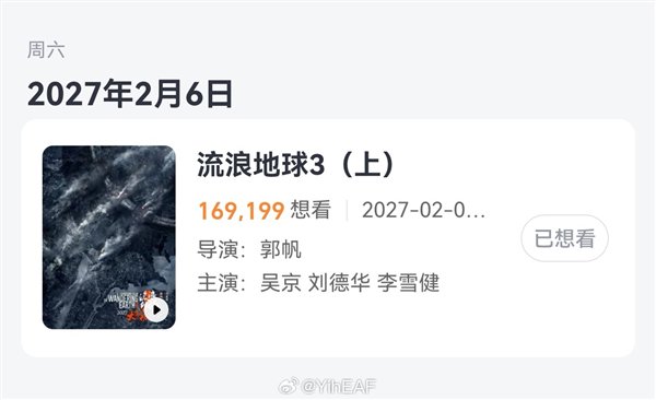 吴京刘德华沈腾主演!欧亿《流浪地球3》定档2027年大年初一