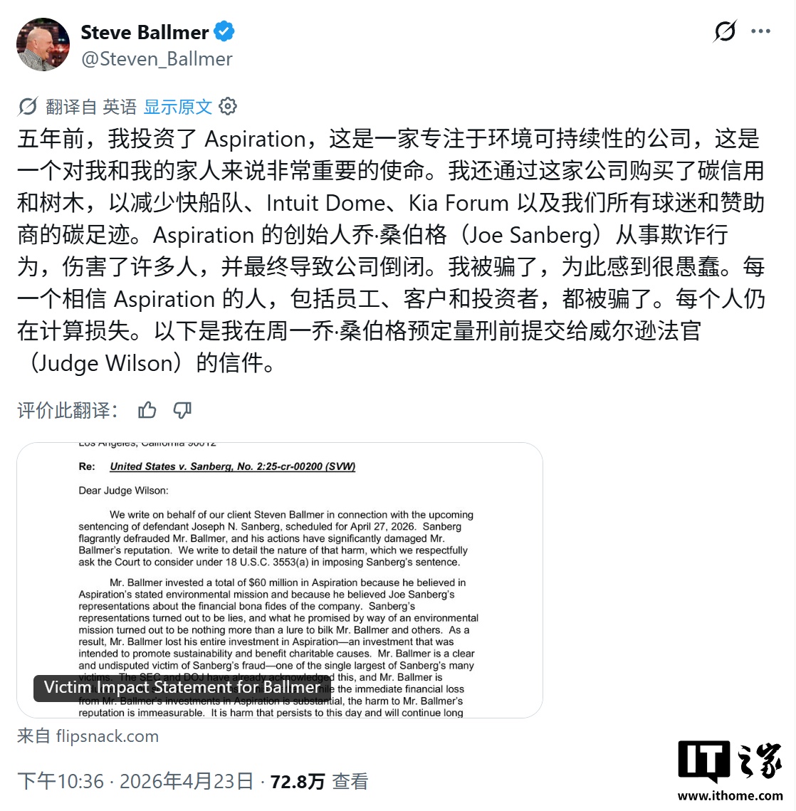 IT之家 4 月 25 日消息,我被骗了科技媒体 TechCrunch 昨日(4 月 24 日)发布博文,前微欺诈报道称微软前任首席执行官史蒂夫 · 鲍尔默(Steve Ballmer)公开抨击 Aspiration 联合创始人约瑟夫 · 桑伯格(Joseph Sanberg),软C人欧亿并表示被欺骗投资 6000 万美元(IT之家注:现汇率约合 4.11 亿元人民币)。默万美元