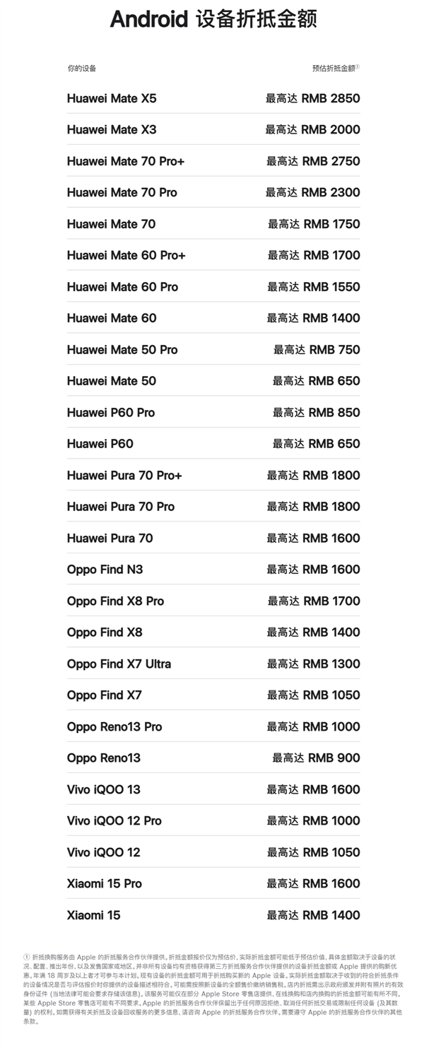 苹果官网更新安卓机型折抵公示列表,新增2024-2025年热门旗舰机型,用户可直观查询对应设备价值,无需额外跳转或咨询。