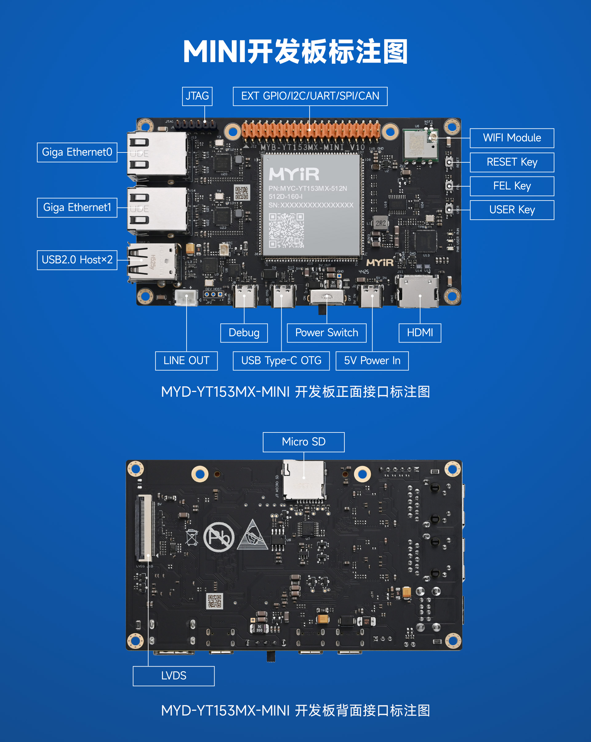 MYD-YT153MX-MINI开发板采用5V/3A直流供电,板载WIFI模块,搭载了2路千兆以太网接口、2路USB2.0 HOST接口、1路USB2.0 Type-C Debug接口、1路USB2.0 OTG Type-C、 1路LINE OUT接口、1路兼容树莓派40pin扩展接口、1路HDMI接口、一路JTAG调试接口、1路Micro SD接口、1路LVDS接口。
