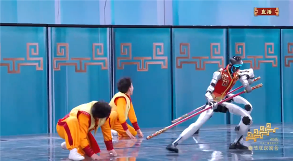 松延动力的体化仿生人形机器人与著名演员蔡明配合演绎小品;宇树科技的人形机器人丝滑演绎中国武术。