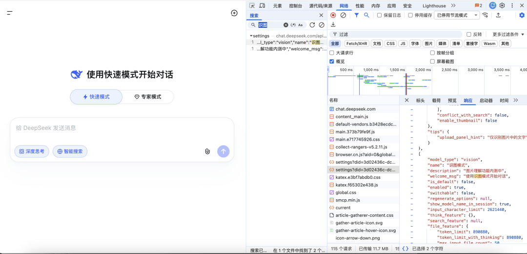 图丨通过浏览器开发者工具抓取 chat.deepseek.com 的 settings 接口可以看到该模式的后端配置已经下发:"model_type": "vision"、"name": "识图模式"、"description": "图片理解功能内测中"、"enabled": true、"is_default": false、"switchable": false。也就是说,识图模式已经在后端启用,但默认关闭、不允许用户手动切换。(来源:DeepTech)