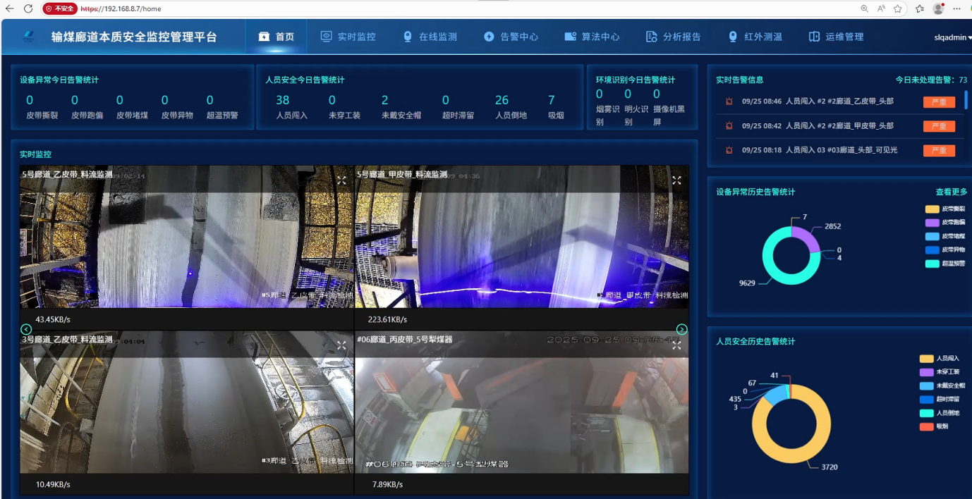 在实际应用中,该系统已展现出显著成效:在高粉尘煤矿输煤廊道连续运行 3 个月无故障,低光照环境下可清晰捕捉设备异常细节,强振动场景下巡检数据准确率保持 95% 以上。通过智能化升级,单条廊道年均节省电能 1000 度,减少二氧化碳排放 3.6 吨,单位物料输送能耗降低 8%;同时替代 60% 人工巡检工作量,年均减少人工成本支出 20 万元,巡检效率提升 60%,设备故障处理时间缩短 40%,为电厂带来了可观的经济收益与安全保障。