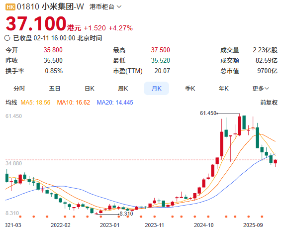 此前小米股价遭遇4个月连跌,本月止跌,目前为37.1港元,距离47港元还有26%涨幅空间。