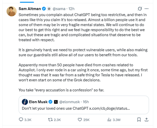 事关AI聊天机器人欧亿和自动驾驶!马斯克和奥尔特曼隔空互喷