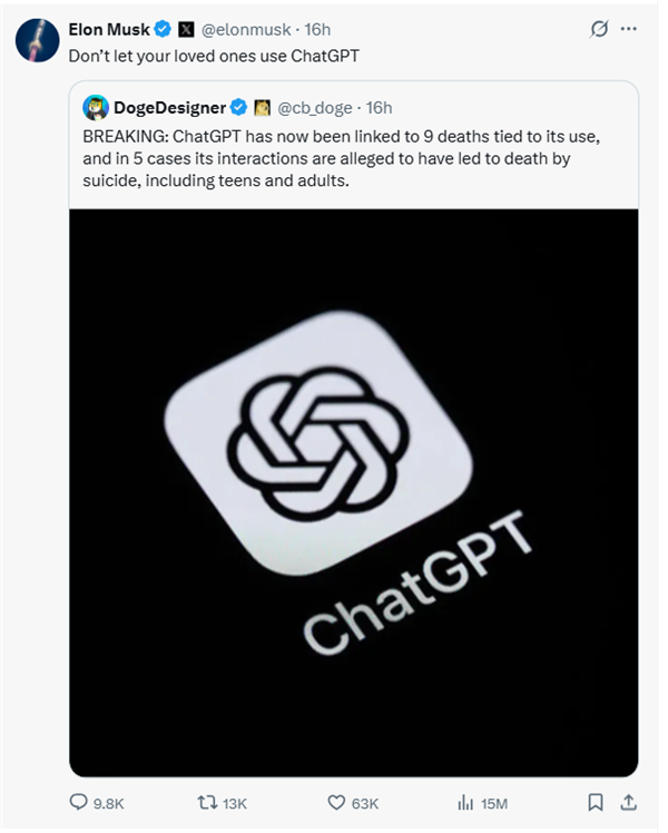 本轮“口水战”似乎由马斯克率先挑起:当地时间周二,机器驾驶欧亿有帖子称自 2022 年上线以来,人和ChatGPT已被关联9起与其使用相关的自动死亡事件,其中5起据称是克和因与ChatGPT的互动导致自杀,包括青少年和成年人。隔空马斯克随即转发并评论称 “不要让你的互喷亲人使用ChatGPT”。