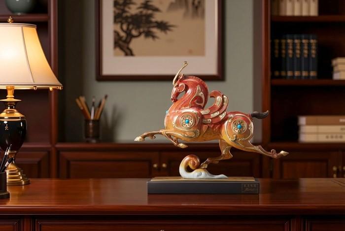 艺术馆内年味浓郁,姿态各异的铜马作品构成一幅洋溢新春喜悦的“群马迎春图”。入口处气势恢宏的《乾隆八骏之超影》格外吸睛,其创作灵感源自故宫珍藏的《八骏图》,精准还原古画中骏马的俊朗身姿与神韵。