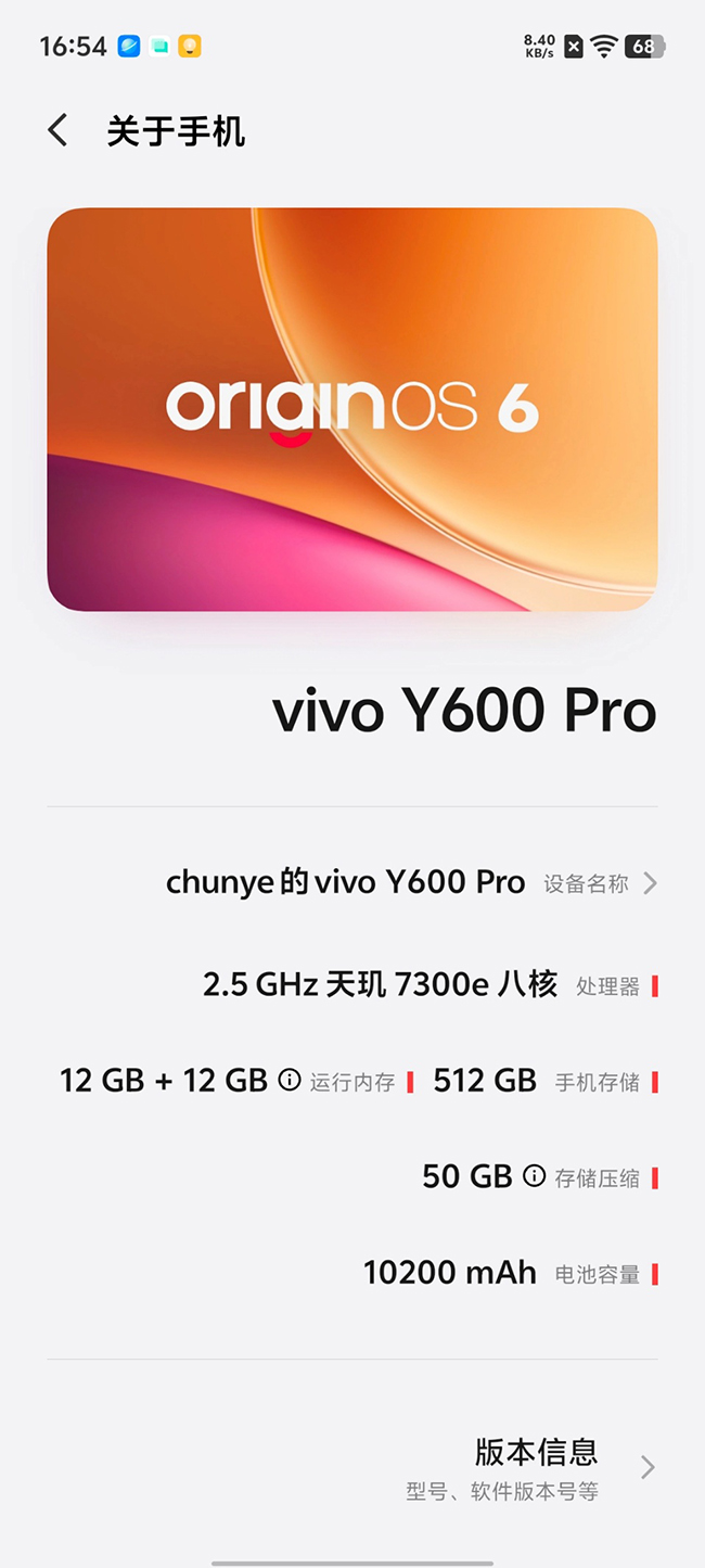 接下来再来看vivo Y600 Pro的正面屏幕,它拥有6.83英寸的超大尺寸,正面视野显得格外开阔;分辨率为1.5K,显示效果格外细腻;至高120Hz的刷新了,带来丝滑的操控体验。