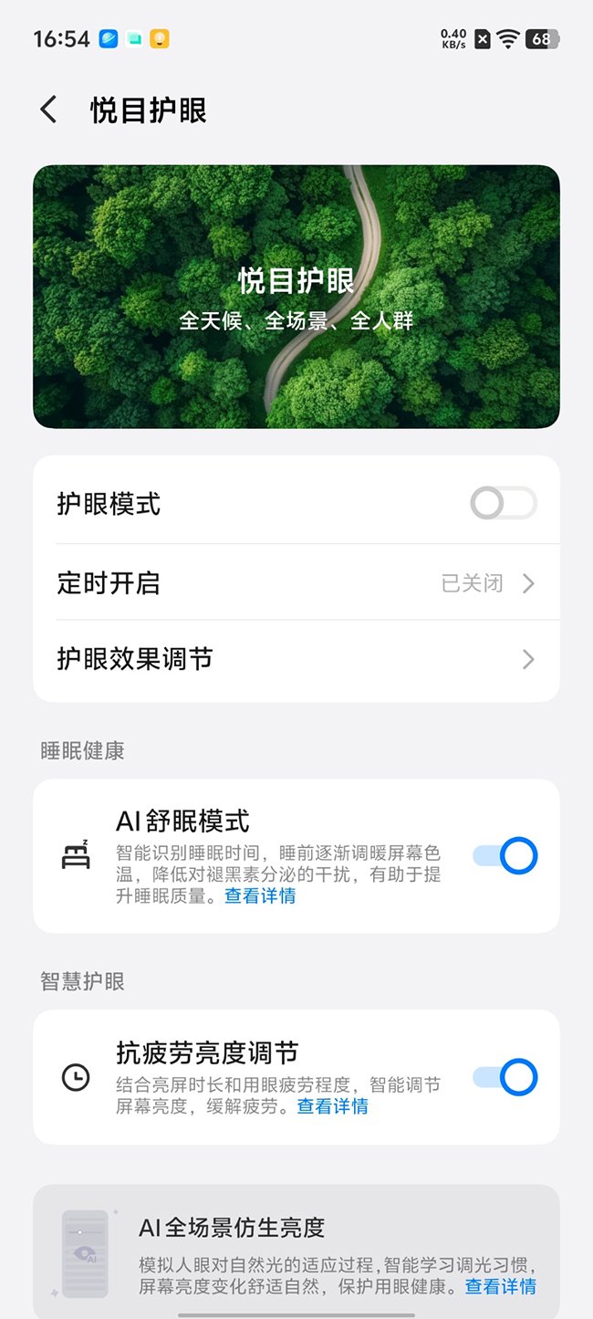 同时这块屏幕在护眼方面做的也是十分到位。它支持抗疲劳亮度曲线,有效缓解久用手机带来眼部疲劳,晕动舒缓显示可以缓解晕车,而A舒眠模式智能识别睡眠时间病动态调节色温。