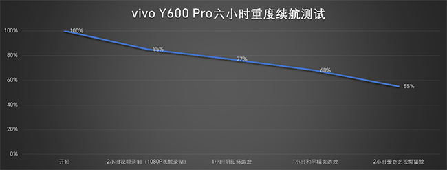 账面参数落实到日常使用中究竟有几分成色?为此我们进行6小时重负载场景续航测试。首先录制了2小时的1080P的防抖视频,电池容量还有85%;接下来是1小时全特效《阴阳师》游戏,电量剩余75%;再接下来是一小时《和平精英》,电量还剩65%;再接下来是2小时的爱奇艺视频播放,电量还剩55%。这意味着即便连续承受6小时的多场景高压负载,电量仍有半数以上的从容冗余。换算到真实生活里,无论是外卖骑手全天亮屏接单导航,还是普通用户出门忘带充电宝,这块电池都能稳稳托住一整天的重度消耗,所谓“电荒焦虑”在这台机器上基本是个伪命题。