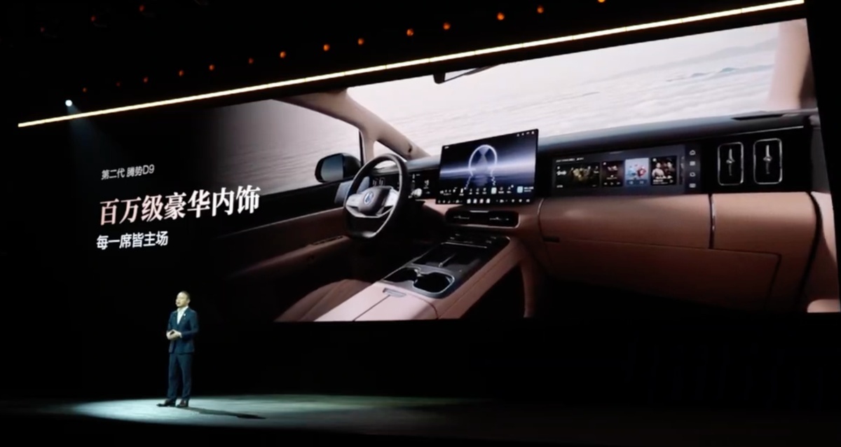 内饰方面,第二代腾势 D9 采用经典 T 字形布局,第二排配备航空座椅及小桌板,并在座椅后方增设两块液晶显示屏,同时提供二排娱乐屏幕,满足商务与家庭场景的多元需求。