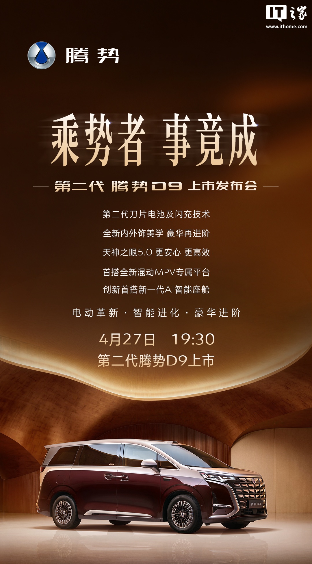 IT之家 4 月 22 日消息,比亚比亚迪第二代腾势 D9 上市发布会今日官宣定档 4 月 27 日 19:30。迪第代腾