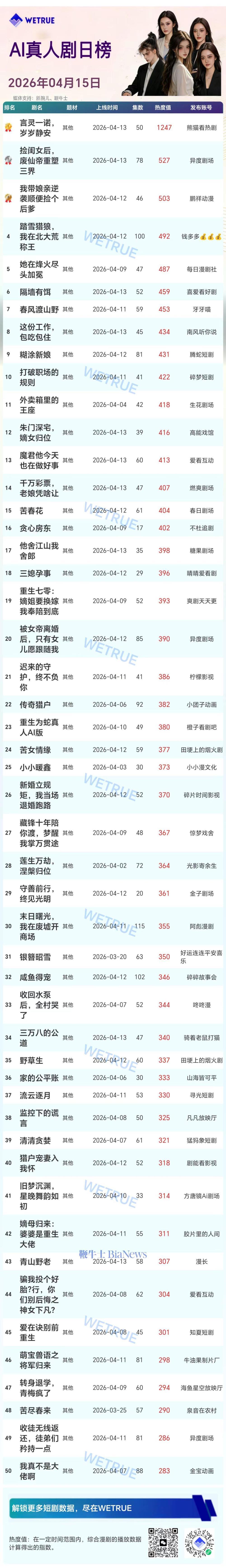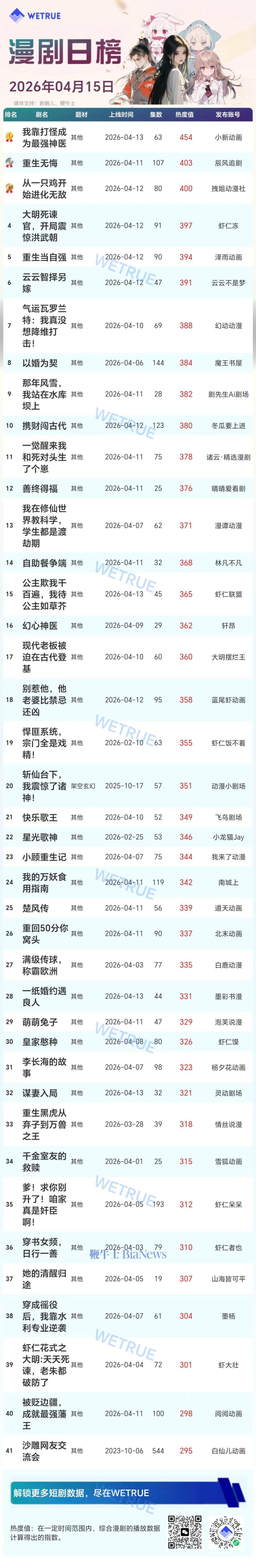 今天发布的日漫是昨天(4月15日)漫剧及AI真人剧日榜。