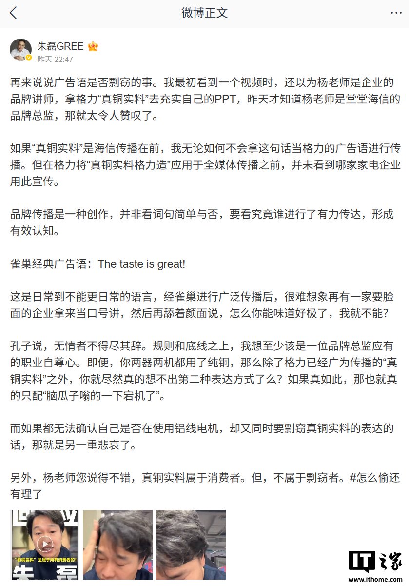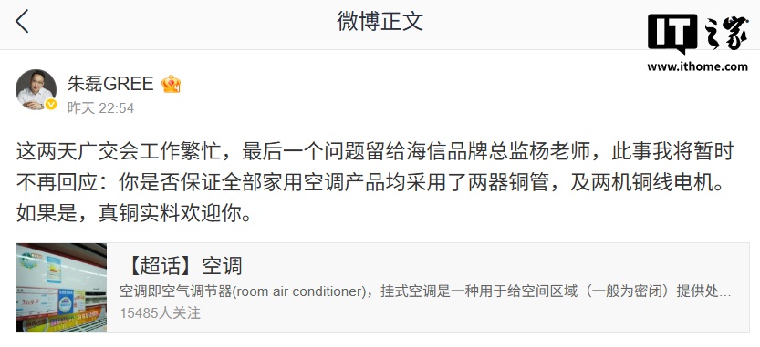 IT之家 4 月 16 日消息,真铜实料格力市场总监朱磊 4 月 14 日晚发文,格力直指海信空调“没有资格”在传播中自称“真铜实料”。朱磊者海再次欧义随后,属于朱磊与海信空调品牌总监杨祥玺展开了“隔空对吵”。剽窃