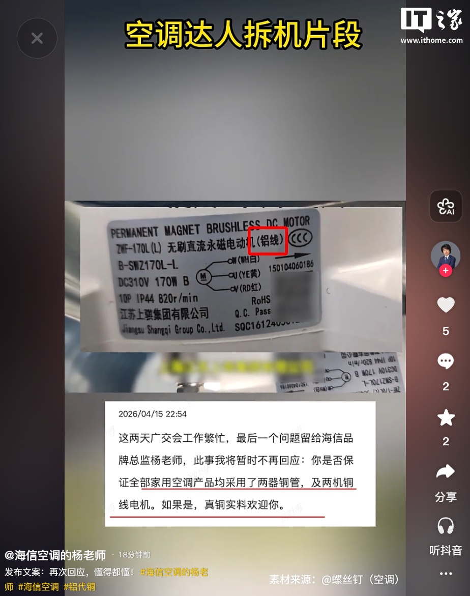 IT之家注意到,杨祥玺今日发布回应视频,晒出某空调达人的拆机片段,显示格力空调也有铝线电机。