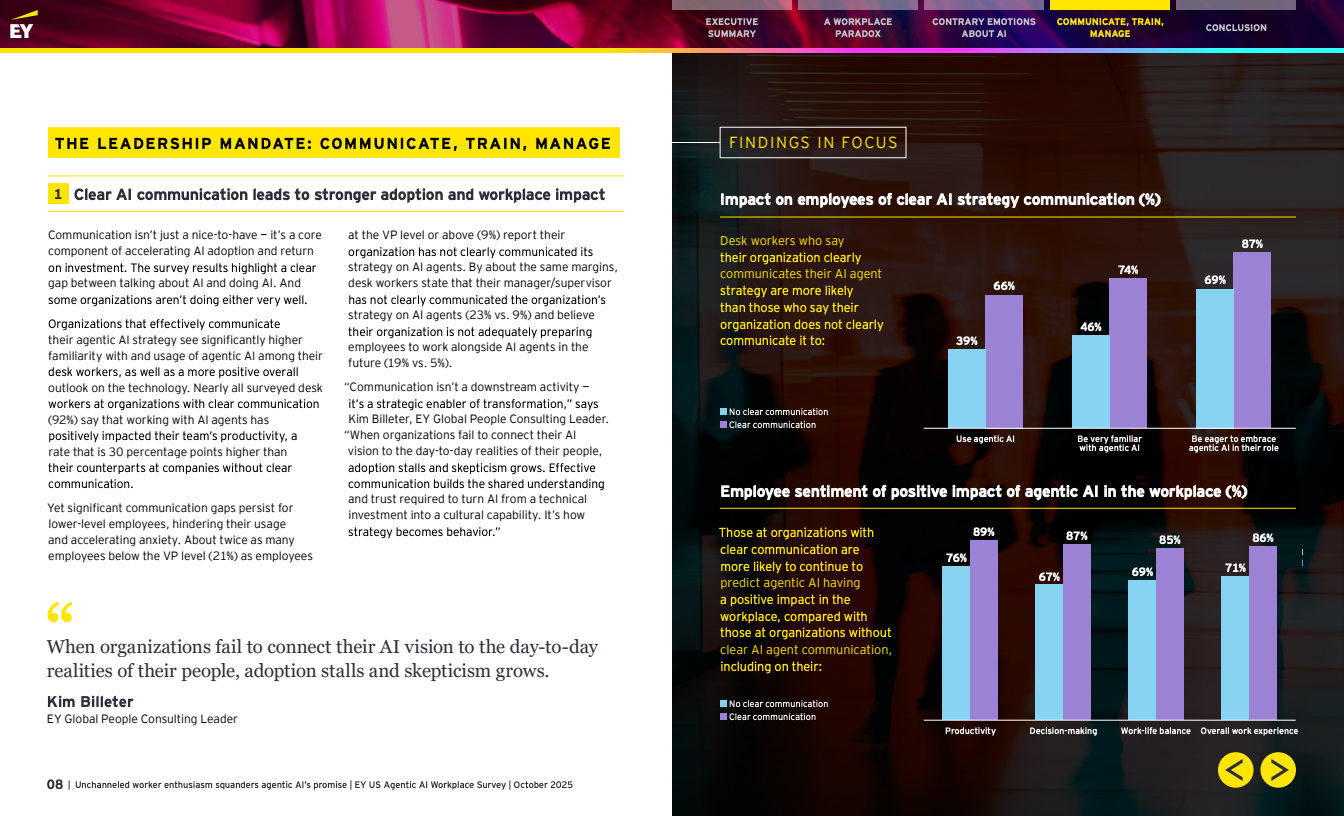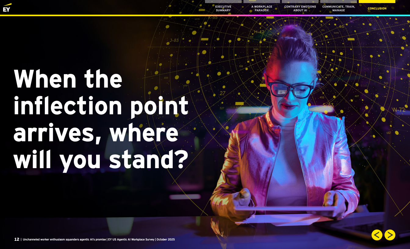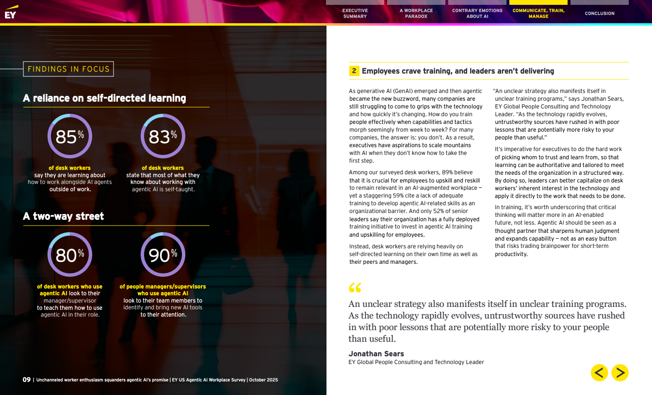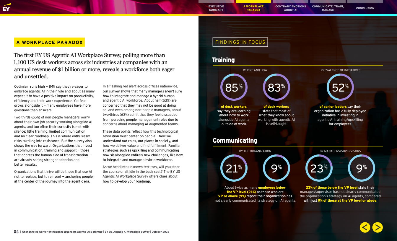 趋势洞察:数据指向一个清晰结论——能动型AI带来的红利能否兑现,取决于组织是否把沟通、结构化培训与管理再设计放在战略中央。若领导层快速构建清晰愿景、可操作的上岗培训和混编团队管理规范,员工主动性将转化为可持续生产力;否则,当前的热情极可能演变为抵触,削弱长期竞争力。