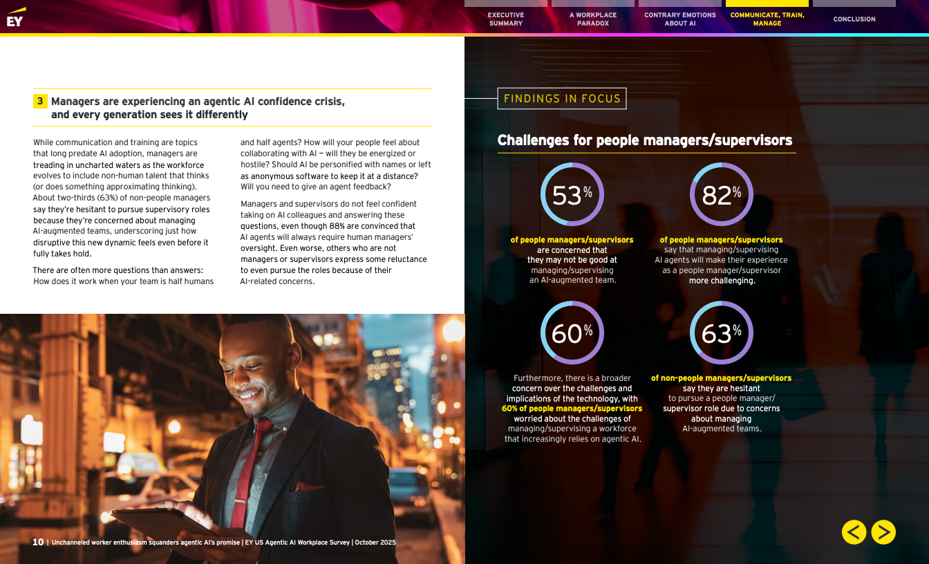 管理者信心危机:63%的非管理者因不愿管理AI混编团队而犹豫,53%的现任管理者担心自己难以胜任此类团队;88%认为AI仍需人类监督。代际差异显著:Gen Z对工具熟悉(约90%)且更为乐观,Gen X管理者对自身掌控能力自信度高达约94%。