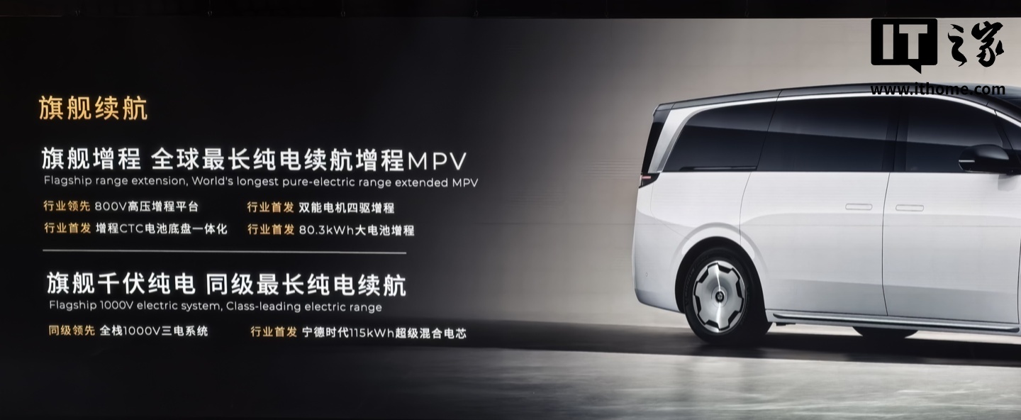 配置方面,官方宣称该车为全球最长纯电续航增程 MPV,行业领先 800V 高压增程平台、行业首发增程 CTC 电池底盘一体化、行业首发双能电机四驱增程、行业首发 80.3kWh 大电池增程。此外,该车还提供纯电版本,配备同级领先全栈 1000V 三电系统、行业首发宁德时代 115kWh 超级混合电芯。