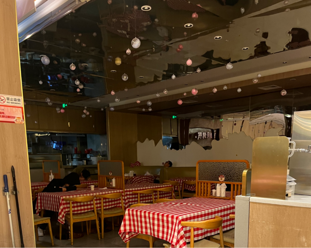 下午的阳光让人感觉暖和了一点。小月推开店门,餐厅里一片昏暗,只有角落还亮着几盏小灯。店里很安静,偶尔有刷抖音的细碎声响,有时传来均匀的鼾声。店员们有的趴在桌上,有的蜷在角落的沙发里,偷得片刻安宁。