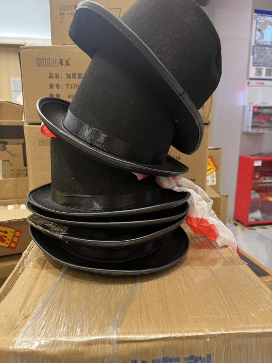 搬得太快,楼下装卸挤成一团,大家趁机歇口气。一位身形胖胖的店员,随手拿起了一顶魔术帽,把红白丝巾叠好,往里塞,然后猛地一抽,丝巾卡住了,表演失败。周围人哄笑,“这放太久了,就不够滑了”。