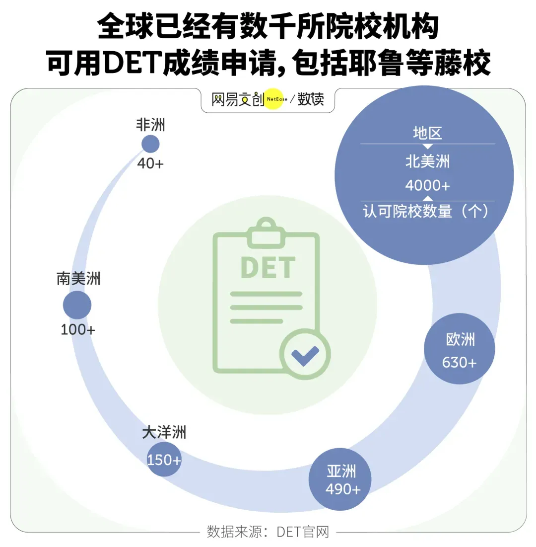 而更能让考生们放心的点在于,虽然考试形式轻量化,但DET的认可度并不“轻”。“闷声发大财”的DET考试,目前全球已有100多个国家、6000多所院校项目认可其成绩。