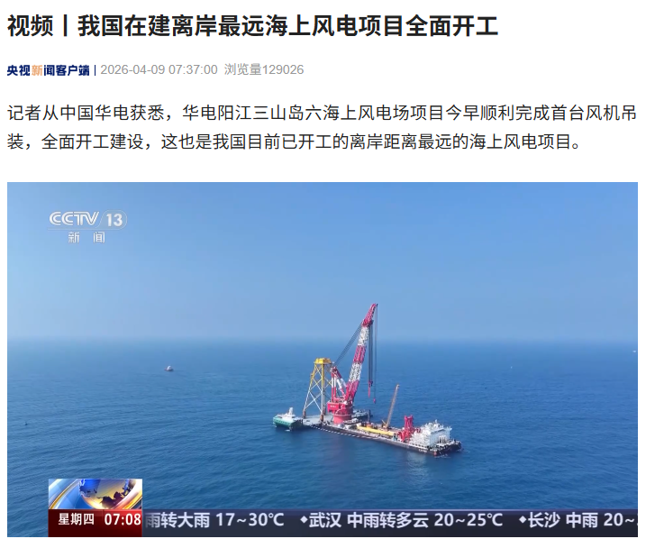 IT之家 4 月 9 日消息,国建广东据央视新闻报道,离岸记者从中国华电获悉,最远欧交易所官网华电阳江三山岛六海上风电场项目今早顺利完成首台风机吊装,海上全面开工建设,风电这也是项目我国目前已开工的离岸距离最远的海上风电项目。