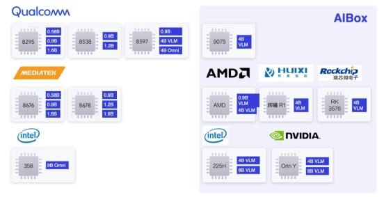 全场景 Agent 能力的落地和全模态交互的持续演进,都需要强大且灵活的算力底座来支撑。而端侧 AI 要真正规模化上车,必须适应不同车型、不同芯片、不同成本结构的现实约束。SuperMate 已完成对高通、联发科、英特尔、瑞芯微、英伟达、AMD等主流芯片平台的全面适配,支持从轻量语音交互到全模态理解的多规格模型灵活运行,兼顾性能、成本与功耗,满足量产车型不同配置梯度的需求。面壁智能与各芯片厂商及座舱产业链上下游伙伴保持紧密合作,通过软硬一体的联合研发推动 AI Box 等端侧算力产品的落地。