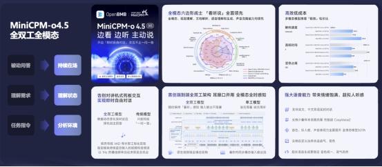 随着面壁智能最新发布的 MiniCPM-o 4.5 全模态模型的成熟,SuperMate 将进一步引入全模态交互能力。该模型具备原生全双工交互能力——在输出时仍能持续感知视觉与听觉输入,无需等待用户说完即可自主判断交互时机。这意味着座舱 AI 将不再是"一问一答"的回合制对话,而是能够像一个始终在线的副驾一样,边听、边看、边主动回应。