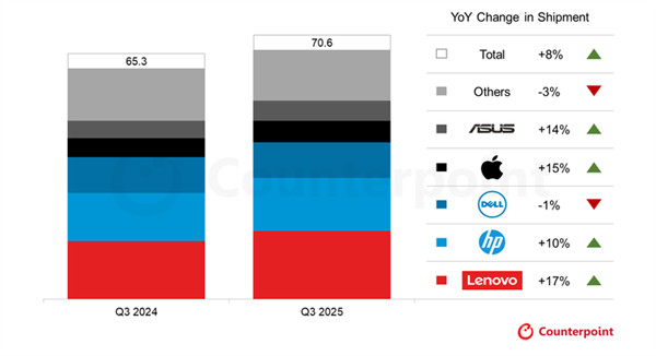 游戏本则分成了两个方向:高端机型专门满足核心玩家对极致性能的需求,中端机型则在价格、散热和噪音控制上竞争更激烈。商用本因为企业集中换机,成了稳定市场的“压舱石”,CounterPoint的数据显示,Windows 10停止服务是2025年三季度全球PC销量增长的主要原因。