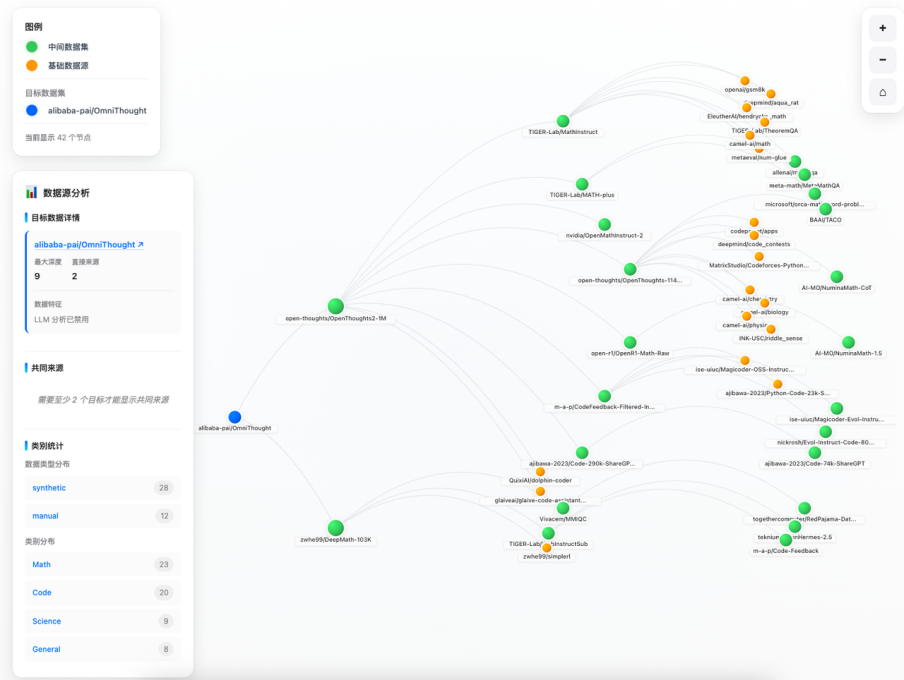 其次,针对数据界常见的「近亲繁殖」问题,ODA 全新发布「数据血缘探索器」。它像绘制族谱一样,清晰地刻画出数据集之间的继承、混合与蒸馏关系。通过结构化建模与可视化展示,研究者可以直观地看到不同数据集之间的高度重叠与依赖关系,看到社区中被反复复用的核心数据源,以及更清晰的发现潜在的训练–测试污染与「近亲繁殖」问题。这一能力让「为什么某些数据集长期霸榜」不再是经验结论,而是可以被结构性解释的现象。