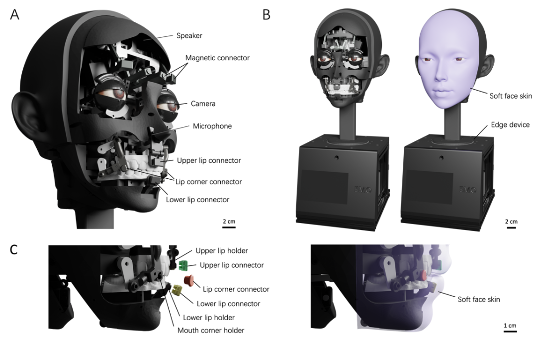 图 2. 机器人唇形硬件结构。(A)面部机器人设计概览,重点展示了人机交互关键组件:包括扬声器、麦克风、高清摄像模块,以及用于固定柔软硅胶面皮的磁吸式快拆连接器。该连接器能实现面皮的精准定位,并通过推拉双向运动驱动硅胶面皮,完成说话时所需的复杂唇部动作。(B)搭载柔软硅胶面皮的人形机器人外观展示。其底座内部集成有边缘计算设备。(C)唇部驱动系统特写,展示上唇、下唇与唇角连接器分别对应固定于相应唇部支架。柔软可替换的面皮通过磁吸连接器固定,可便捷拆卸以进行维护或个性化调整。