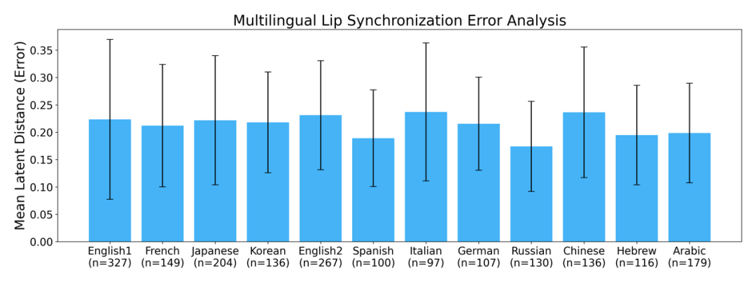 图 5. 多语言唇语同步性能量化表现。x 轴标签下方标注的样本量 n 对应每种语言的测试句子视频帧数。结果表明,所有非英语语言的同步误差均保持在英语误差范围内,显示出稳健的跨语言泛化能力。