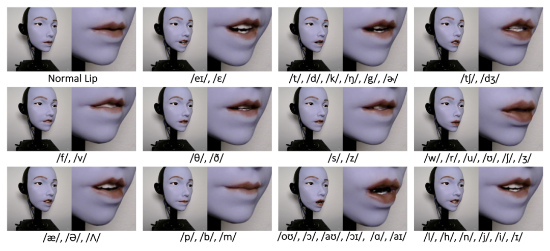 图 3. 机器人能实现的口型及其对应音标展示。该机器人展示了再现关键英语音标的能力,例如爆破音(/p/ 和 /b/)、双唇音(/m/)以及圆唇元音(/u/ 和 /o/)。通过独立控制上唇、下唇及嘴角,每帧图像均捕捉到其实现的典型唇部运动效果。这些数据为机器人在说话时实现正确的唇形匹配奠定了基础。