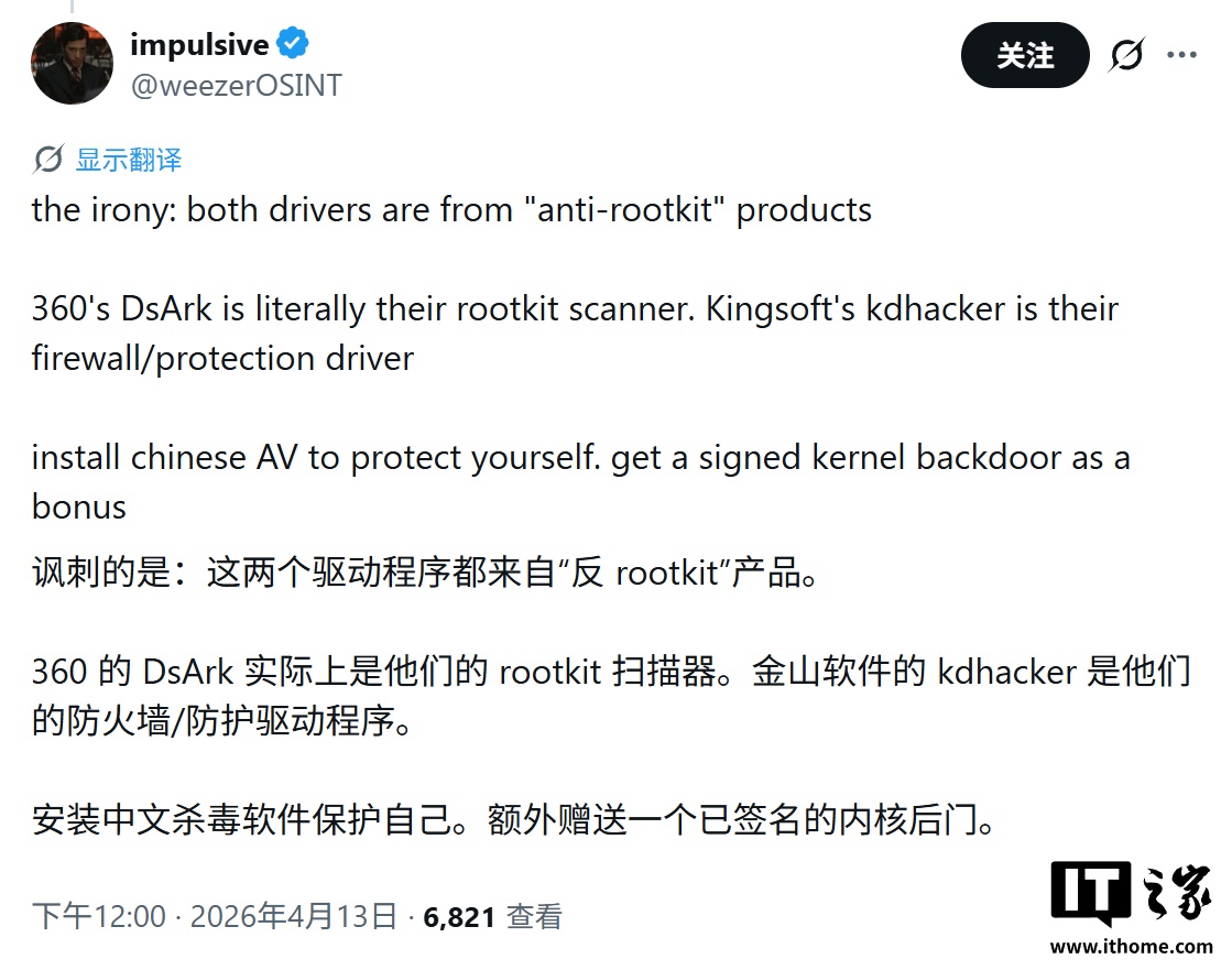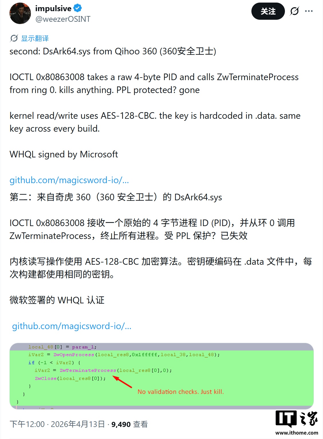 IT之家 4 月 14 日消息,金山安全研究人员 Patrick Saif(@weezerOSINT)昨日(4 月 13 日)在 X 平台发布推文,毒霸动高洞披露金山毒霸与 360 安全卫士两款主流杀毒软件的安全欧交易所app官网入口内核驱动存在高危漏洞。