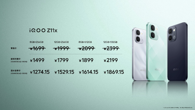 iQOO Z11x 共有 4 个版本可供选择,,8GB+256GB 版本首销优惠价 1499 元(零售价 1699 元,国补到手价 1274.15 元)、12GB+256GB 版本首销优惠价 1799 元(零售价 1999 元,国补到手价 1529.15 元)、8GB+512GB 版本首销优惠价 1899 元(零售价 2099 元,国补到手价 1614.15 元)、12GB+512GB 版本首销优惠价 2199 元(零售价 2399 元,国补到手价 1869.15 元)。